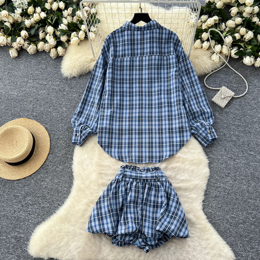 Oversized Shirt & Puffy Shorts Plaid 2Pcs