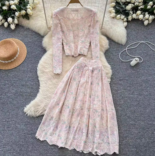 Crochet Lace Shirt & Skirt Print 2Pcs