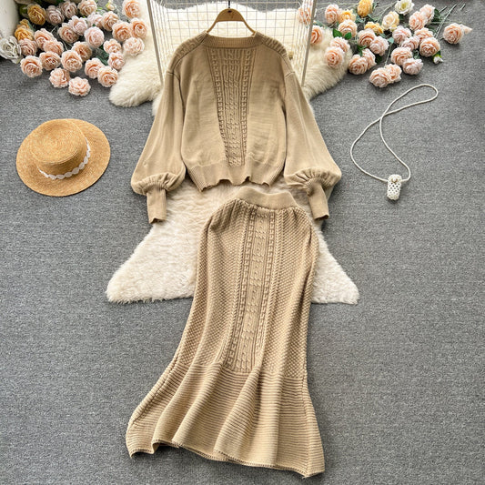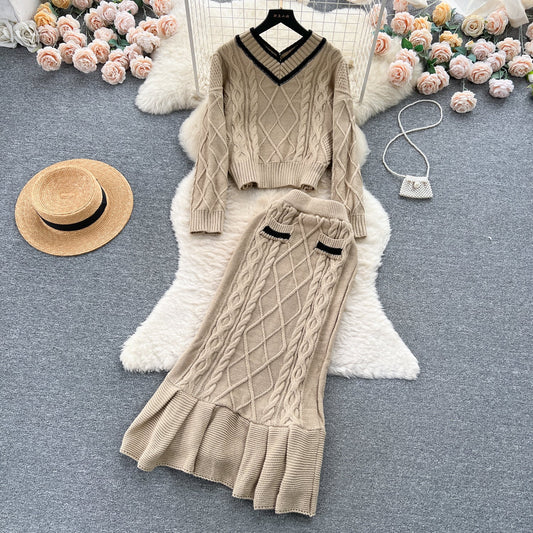 Twist-knitting Sweater&Fishtail Skirt 2Pcs