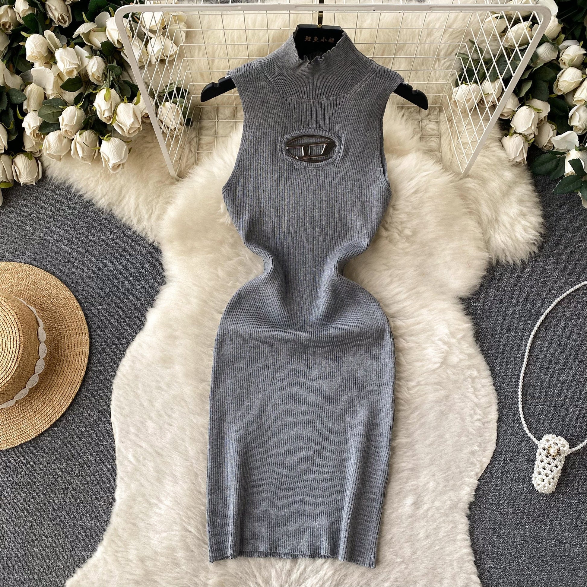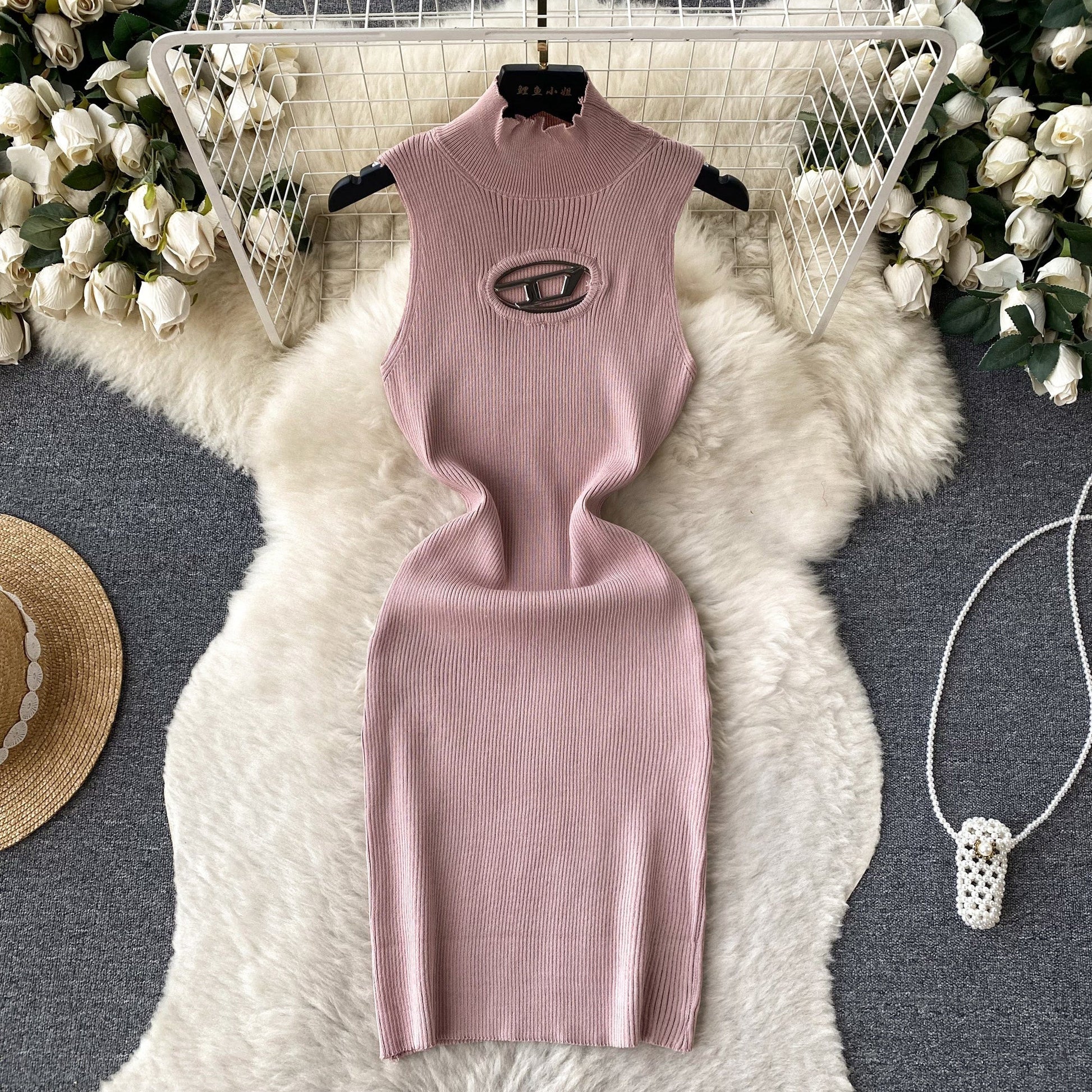 Open-Knit Semi-Turtleneck Bodycon Dress